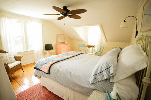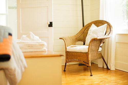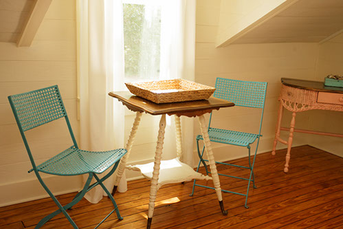 This spacious room has been renovated with a “Shabby Chic” feel. Vintage furniture includes a queen size cast iron bed covered with a handmade quilt, dresser, table, wicker chairs, cable television, and ceiling fan. If you would prefer a private breakfast, it can be enjoyed in your room overlooking our live oak “Crooked Tree.” This suite has its own large bathroom with spacious tiled shower and complimentary terry cloth robes.