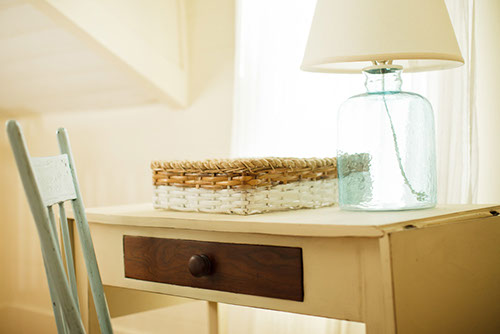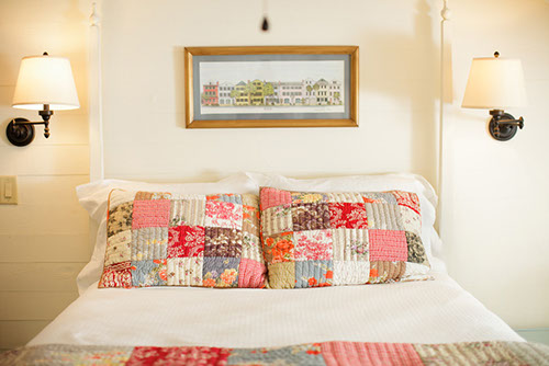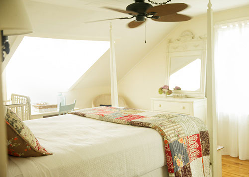 This room is light and airy with a comfortable “Beach House” feel. Furnishings include a queen size four poster bed covered with a handmade quilt, dresser, table, wicker chairs, cable television, and ceiling fan. If you would prefer a private breakfast, it can be enjoyed in your room overlooking our live oak “Crooked Tree.” This suite has its own large bathroom with spacious tiled shower and complimentary terry cloth robes.