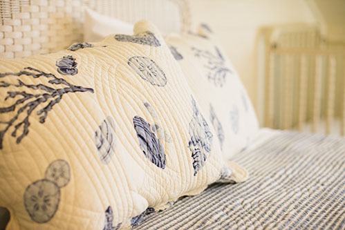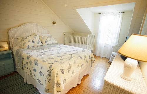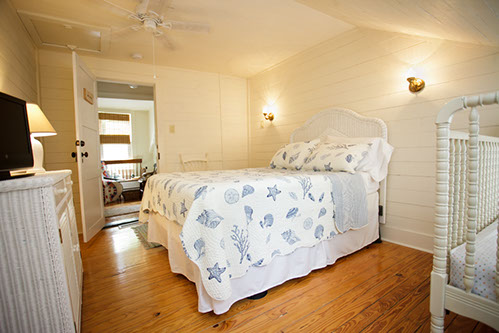 This is our smallest bedroom, but with a cute “beachy” feel. Furnishings include a full size wicker bed and dresser, table, cable television, ceiling fan and a baby bed. This room's dedicated bathroom is just across the hall. It's particularly well-suited for a family with kids, so that the kids can have their own room.